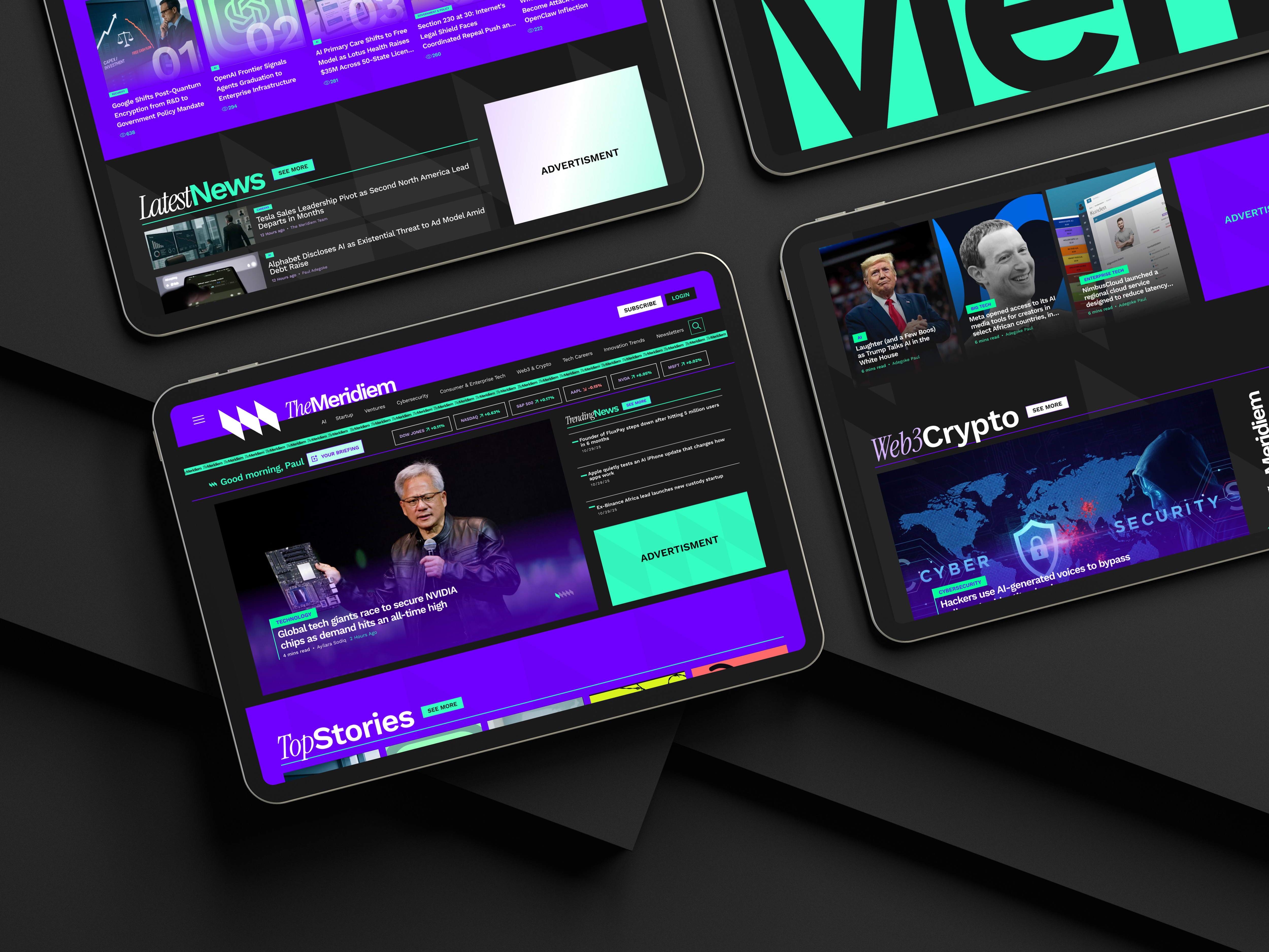 We developed a full visual identity for The Meridiem — one that felt authoritative, modern, and unmistakably African without leaning on cliché. Sharp typographic hierarchy, a restrained colour palette, and an identity system designed to scale across editorial, social, and print.