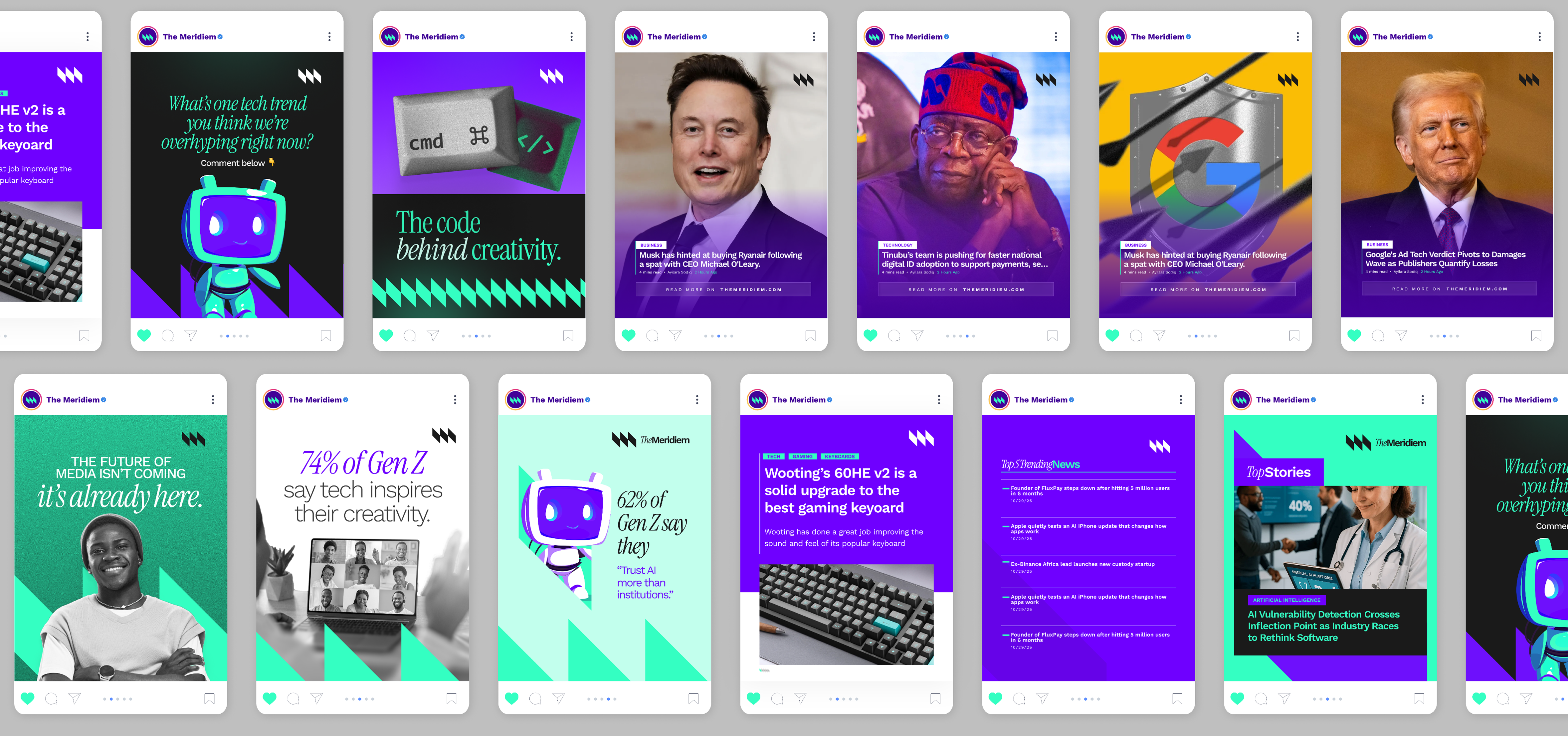 We built The Meridiem's social presence from zero — setting up channels, developing platform-specific content formats, and creating a social voice that mirrors the publication's editorial authority while driving traffic back to the site.